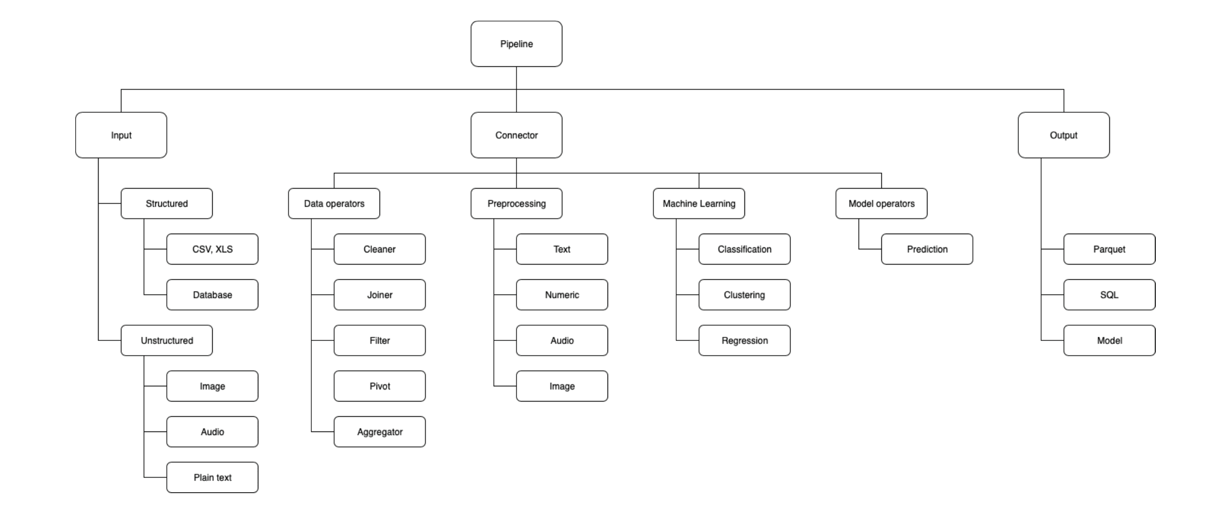To align the team around a shared understanding of the product’s scope, I created an information architecture diagram to illustrate how data flows through the entire pipeline; from input sources to output formats. This diagram helped stakeholders, designers, and engineers visualize the core modules, their relationships, and the functional breakdown of each stage (e.g., data operators, preprocessing, machine learning). It also served as a foundational reference for planning the UI, defining priorities, and ensuring technical feasibility as we merged features from ML Studio into a unified Data Pipeline experience.